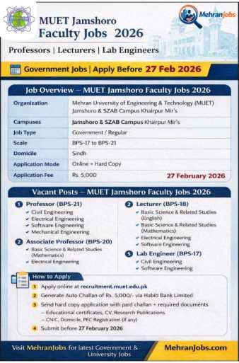 MUET Jamshoro Faculty Jobs 2026 are officially declared by Mehran University of Engineering and Technology (MUET), Jamshoro, as well as