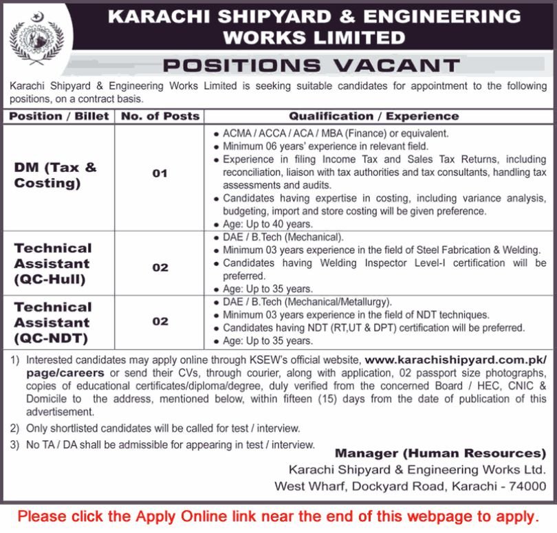 Current Advertisement Karachi Shipyard & Engineering Works Limited Jobs